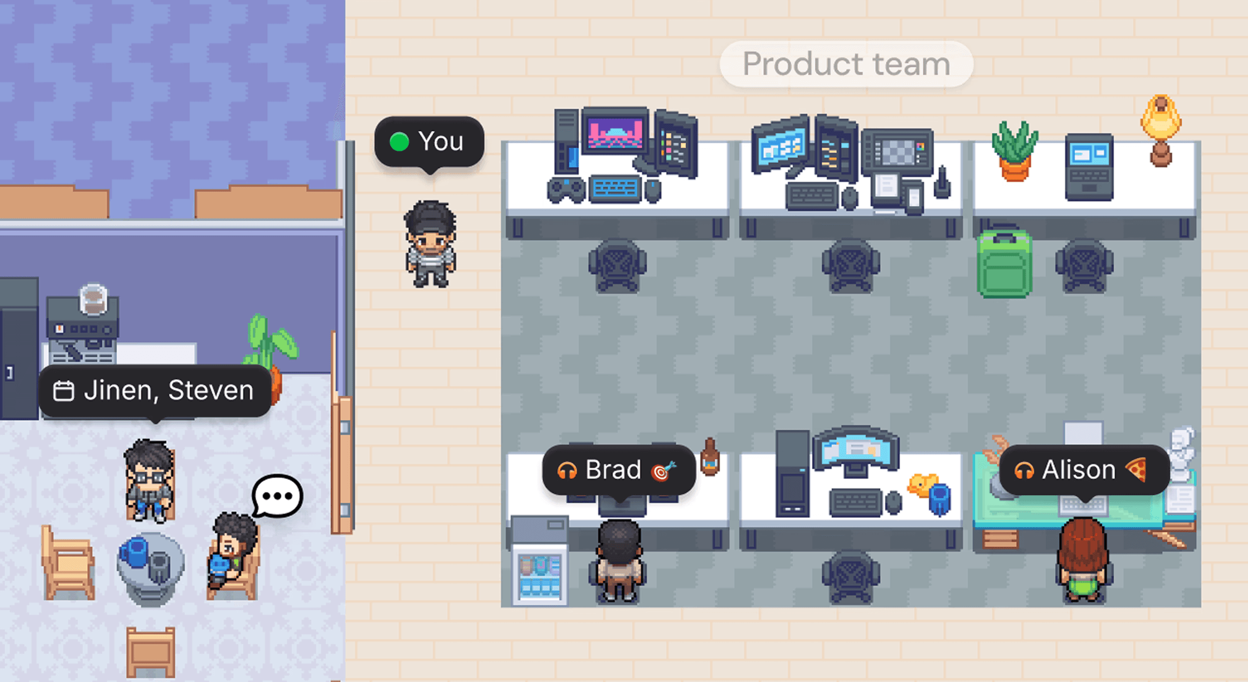 Gather 2.0 は完全に新しいプラットフォームで、モダンでシンプルな UI とリモートチーム向けの強力な新機能を備えて一から作り直されました。より多くのつながりを維持する方法を提供し(会話を耳にし、クリックで参加!)、人々が取り組んでいることについてより多くのコンテキストを提供し(ライブのApp Statusを見る)、より多くの統合を含みます(GitHubやSpotifyなど!)。